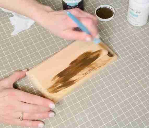 The first thing to do is cover your scrap piece of wood with antiquing wax and wipe it off. I used a baby wipe and it worked nicely. After the wax is dry go ahead and dry brush the white chalk paint on and allow to dry.